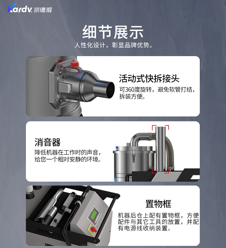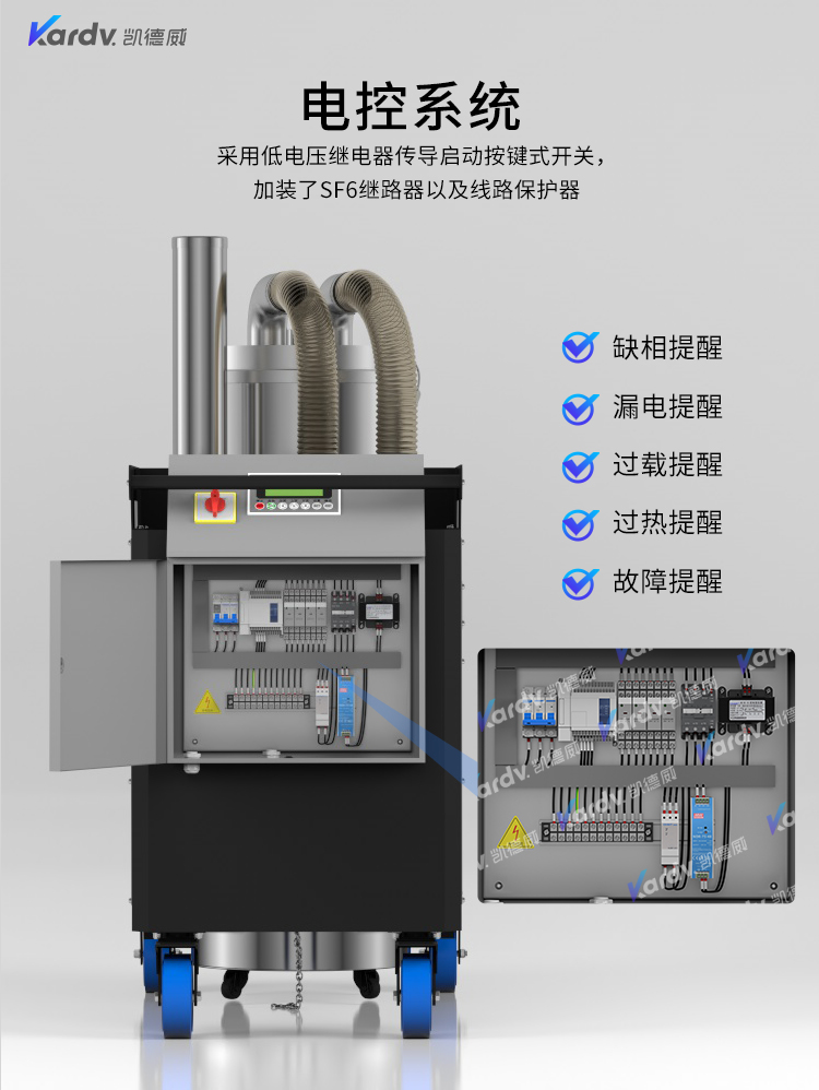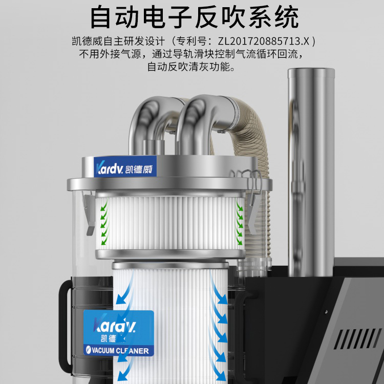 SK - F系列是我司自主研發(fā)的智能型工業(yè)吸塵器。具有以下六大亮點(diǎn): A.整機(jī)采用工業(yè)設(shè)計(jì)風(fēng)格,外形剛勁有力,做工精良美觀。 B.集塵桶固定把手設(shè)計(jì)。C.采用直徑160mm的TPE靜音前后大輪 D.電控系統(tǒng)采用凱德威自主設(shè)計(jì)帶有液晶顯示屏的智能PLC電控控制系統(tǒng) E.動(dòng)力源采用凱德威FY系列定制主機(jī),并選用NSK耐高溫防塵軸承。 F.全自動(dòng)電子反吹清灰系統(tǒng)具有人工免保養(yǎng),吸力強(qiáng)勁、穩(wěn)定,故障率低。 G.集塵系統(tǒng)采用100L不銹鋼材質(zhì)的上下分離桶,桶壁光滑易清理。
