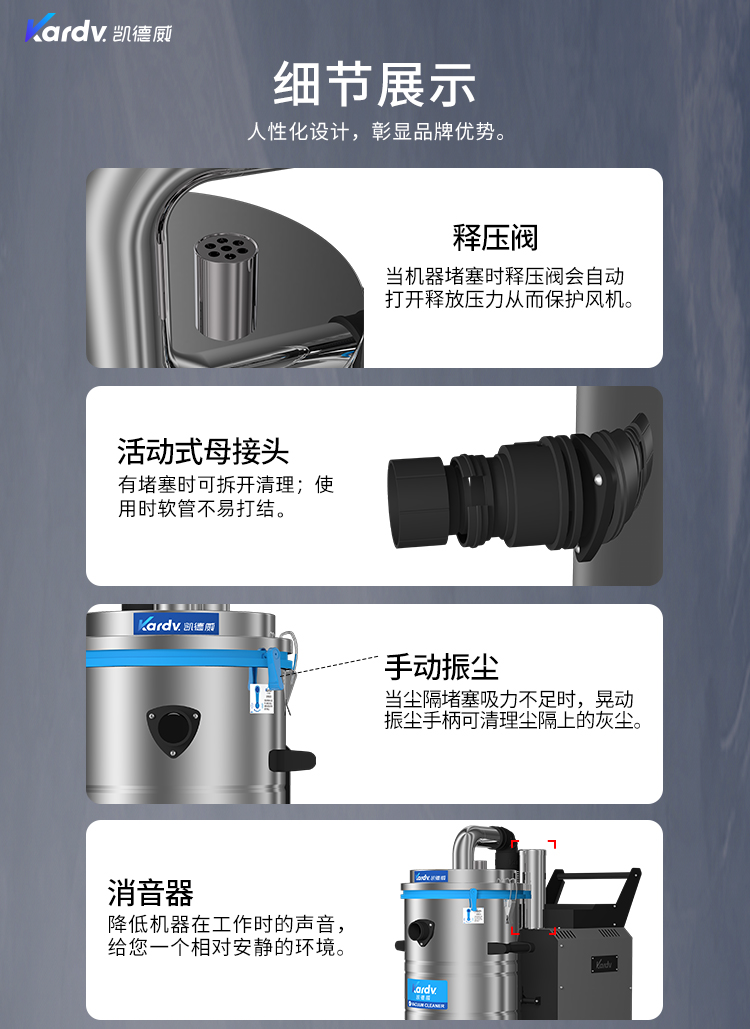 SK-610是一款自主研發(fā)的工業(yè)吸塵器。采用工業(yè)設(shè)計(jì)風(fēng)格,做工好,美觀大氣,黑灰色調(diào)搭配彰顯本機(jī)的工業(yè)風(fēng)格。電控系統(tǒng)采用簡(jiǎn)單易操作的按鍵式控制系統(tǒng),有防缺相,漏電,過(guò)載的保護(hù)。動(dòng)力源采用凱德威FY2.2定制主機(jī),主機(jī)葉片以及外殼為合金材料壓鑄成型,再經(jīng)過(guò)整體拋光噴涂,相對(duì)控制了整機(jī)的熱脹冷縮,風(fēng)量穩(wěn)定,并選用了質(zhì)量穩(wěn)定的軸承。
