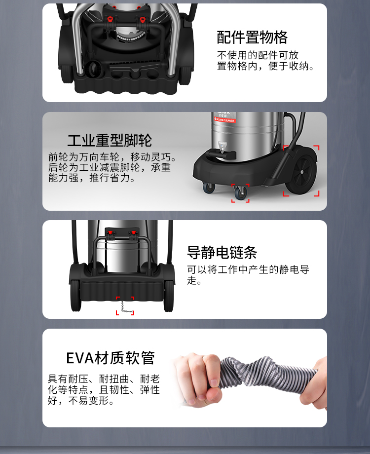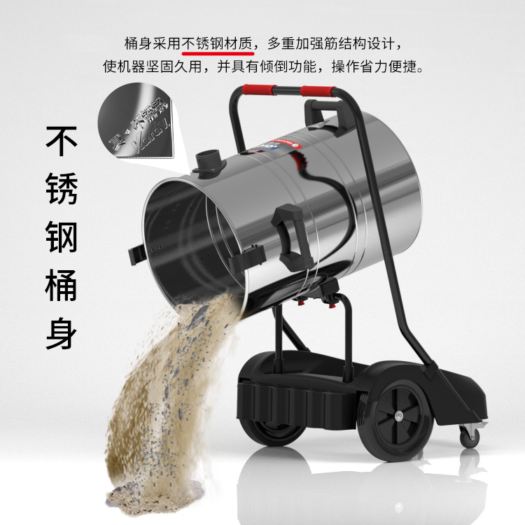 GS-3078S是一款工業(yè)型吸塵器,集塵桶為80L,為不銹鋼材質(zhì),配有車(chē)架,在移動(dòng)時(shí)輕巧方便,車(chē)架底座為PP材質(zhì),底座上有置物格,可放置配件或工具方便收納和使用;可以用在工廠、倉(cāng)庫(kù)或建筑工地等場(chǎng)所清理灰塵等,在商業(yè)環(huán)境中也可以使用。