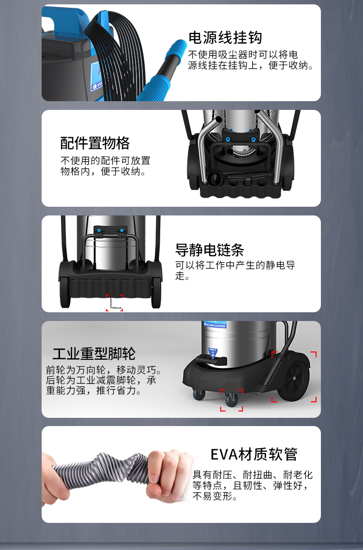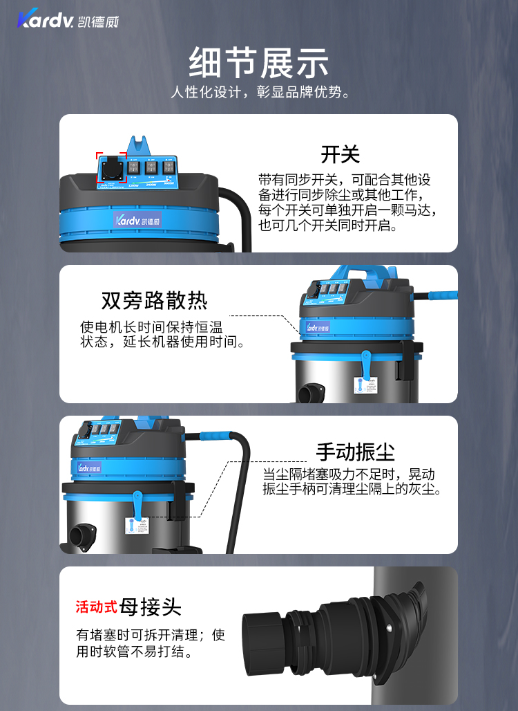 DL-3078S是一款工商業(yè)吸塵器,有3顆馬達(dá),可單獨(dú)或聯(lián)合開(kāi)啟;集塵桶為80L,為不銹鋼材質(zhì),配有車架,在移動(dòng)時(shí)輕巧方便,車架底座為PP材質(zhì),底座上有置物格,可放置配件或工具方便收納和使用;配有手動(dòng)晃動(dòng)振塵,在使用的過(guò)程中,左右晃動(dòng)振塵手柄就可以起到清理過(guò)濾器的作用;可以用在工廠、倉(cāng)庫(kù)或建筑工地等場(chǎng)所清理灰塵等,在商業(yè)環(huán)境中也可以使用。
