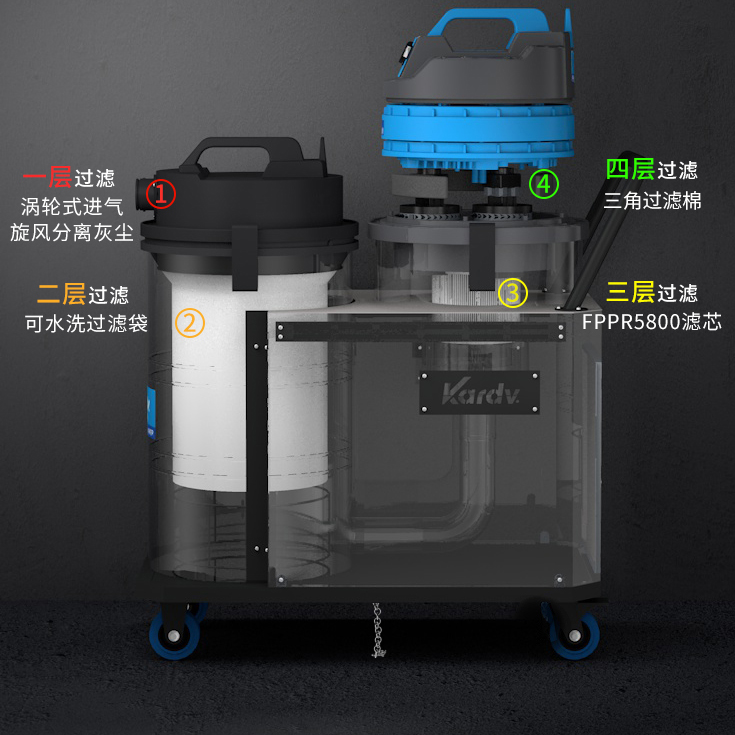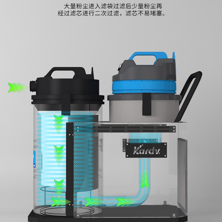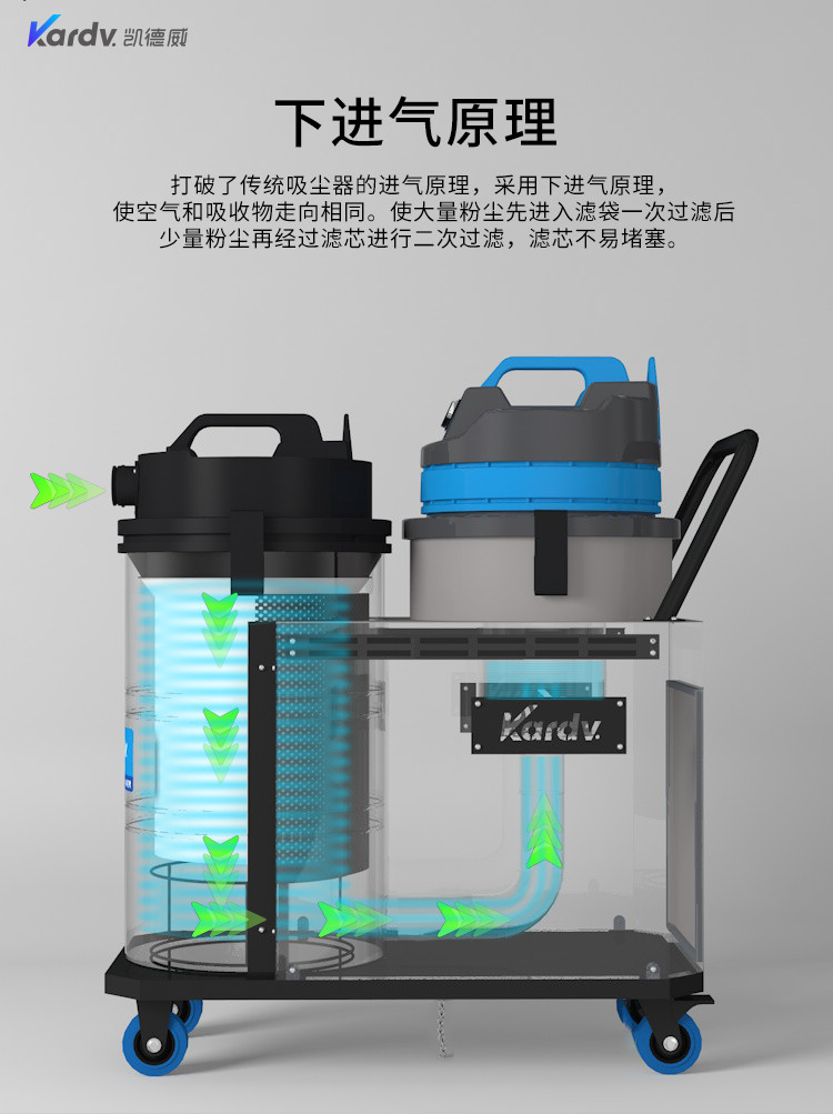 DL-3078X由我司設(shè)計(jì),區(qū)別常規(guī)吸塵器的進(jìn)氣方式,采用下進(jìn)氣原理,在吸細(xì)小粉塵、紡織廠棉絮、棉絲等容易堵塞過濾器的垃圾時(shí),使大部分垃圾直接進(jìn)入布袋過濾,少量物質(zhì)再經(jīng)過濾器二次過濾,這樣解決了過濾器易堵塞的問題。
